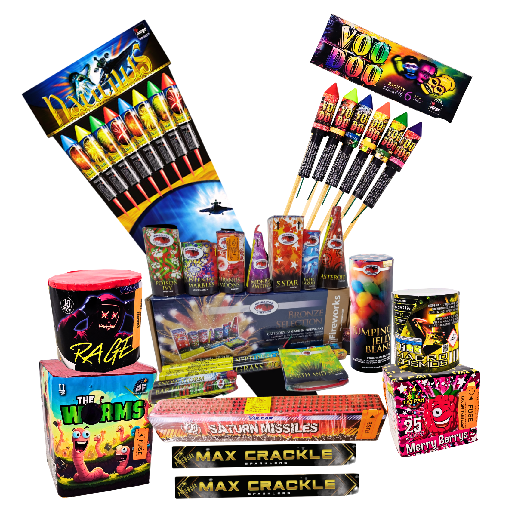 BOOM 125 DISPLAY PACK - Great pieces for the whole family to enjoy. An all round perfect garden display kit consisting of sparklers, cakes, rockets, fountains.