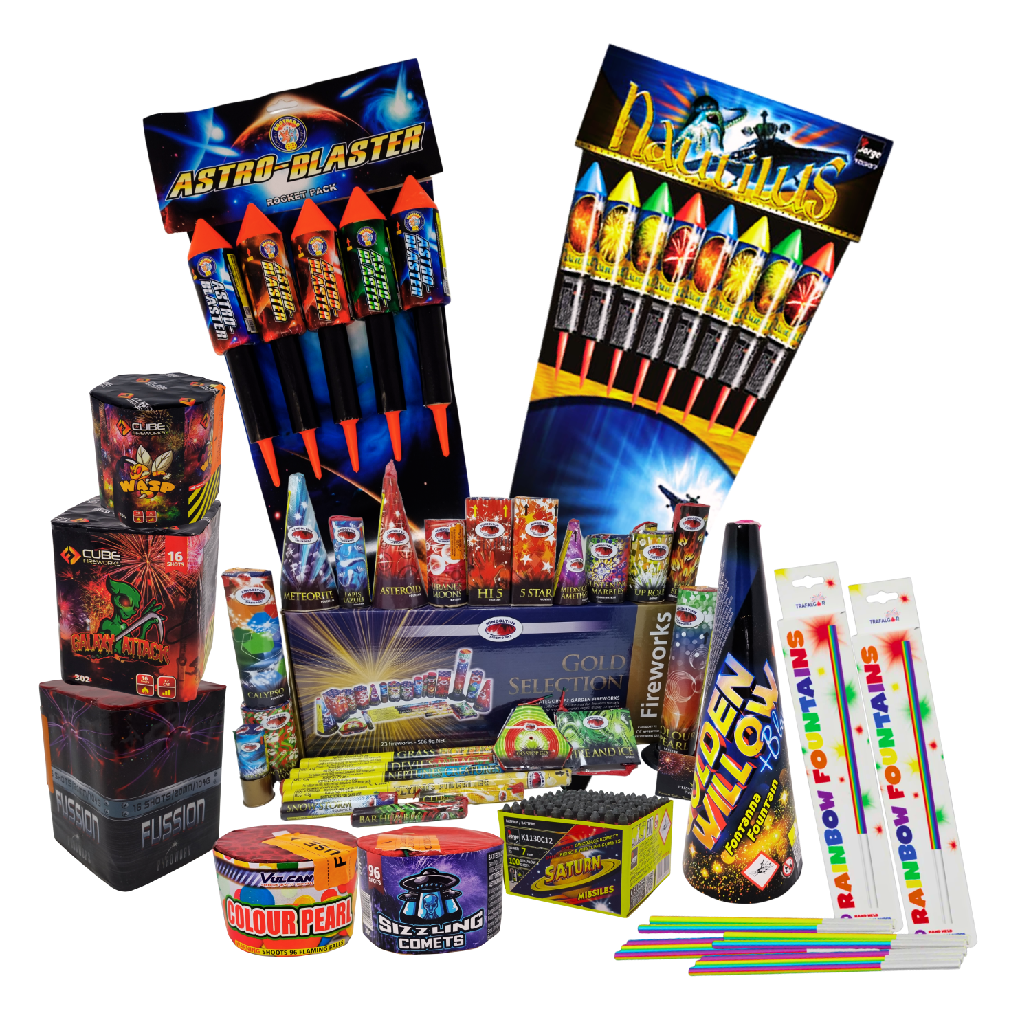 This magnificent display pack offers a dazzling assortment of fireworks perfect for any small to medium-sized backyard. At its core is the Kimbolton gold selection, known for its exceptional quality. This selection includes loud rockets, stunning fountains & cakes. All...